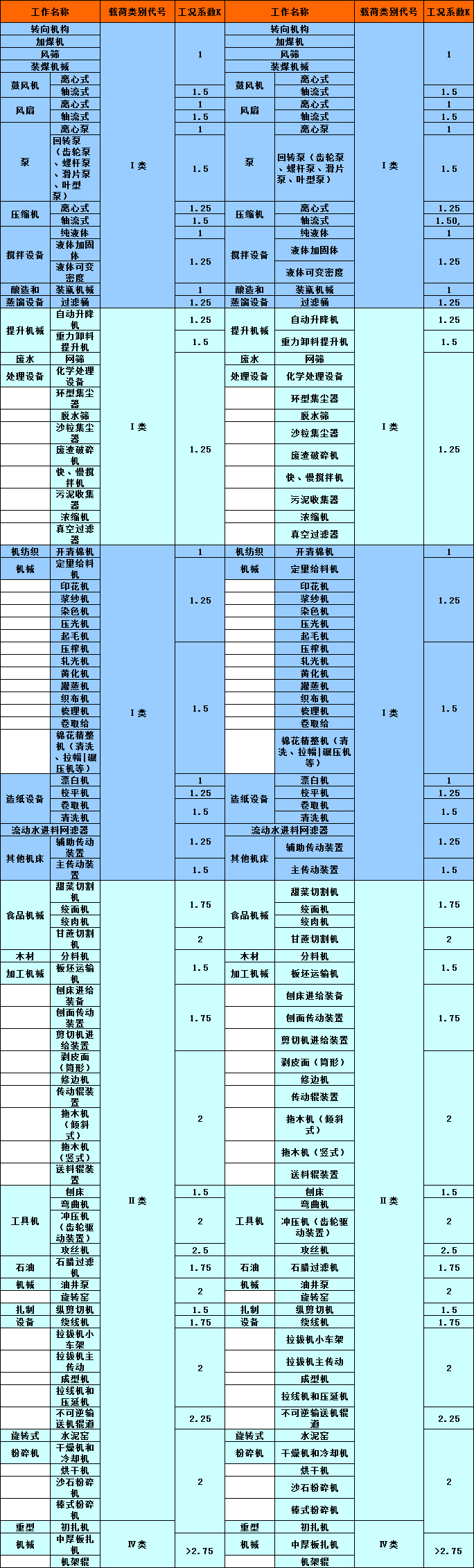 載荷分類 | 均勻載荷 | 中等沖擊載荷 | 重沖擊載荷 | 特重沖擊載荷 |