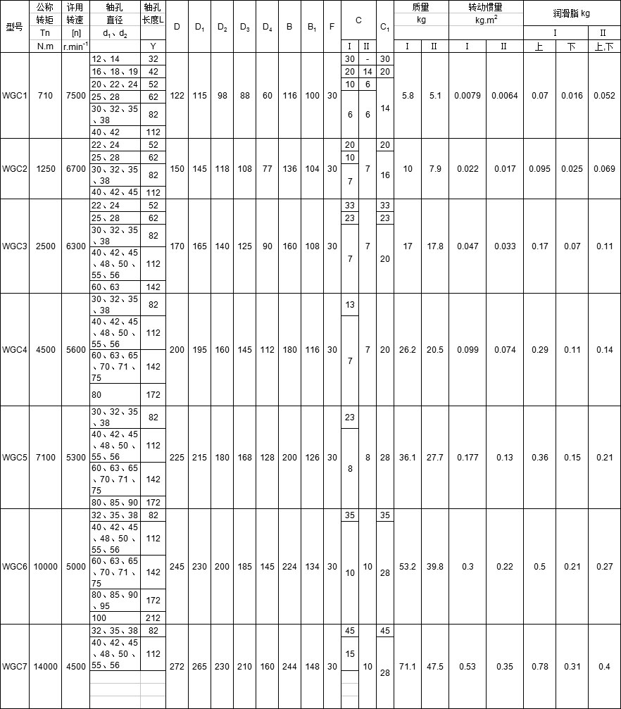 WGT型--接中間套型,適用于兩軸長距離聯(lián)接,許用轉(zhuǎn)速[n]取決于中間套的長度和質(zhì)量,并應(yīng)驗(yàn)算臨界轉(zhuǎn)速;