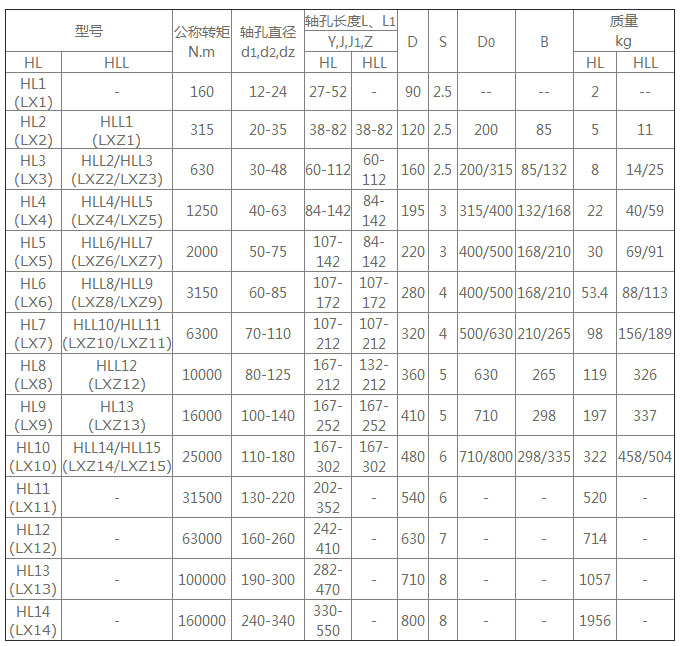 HL,HLL(LX,LXZ)彈性柱銷聯軸器 特點及應用場合:具有微量補償性能,結構簡單,容易制造,更換柱銷方便,可靠性差,適用于有軸向竄動,起動頻繁,正反轉的軸系傳動,不適用于工作可靠性要求精度高的部位,不宜用于高速、重載及有強烈沖擊振動的軸系傳動,安裝精度低的軸系亦不應選用。